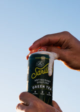 Organic brewed green tea (PFAS-free filtered water, organic green tea from Rwanda), organic hibiscus, organic monk fruit.